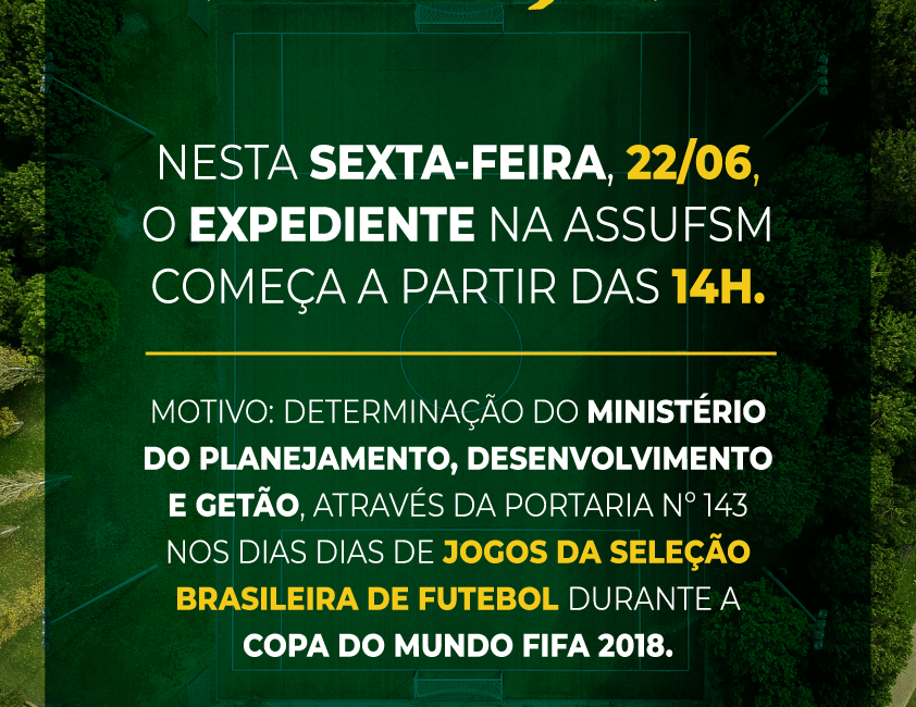 A Assufsm informa que nos dias que tiver jogos da Seleção Brasileira durante a manhã, o turno de expediente será a partir das 14h. Já quando os jogos se realizarem no período da tarde, o expediente terá encerramento às 13h.