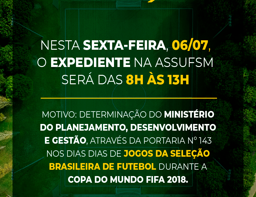A Assufsm informa que nos dias que tiver jogos da Seleção Brasileira durante a manhã, o turno de expediente será a partir das 14h. Já quando os jogos se realizarem no período da tarde, o expediente terá encerramento às 13h.
