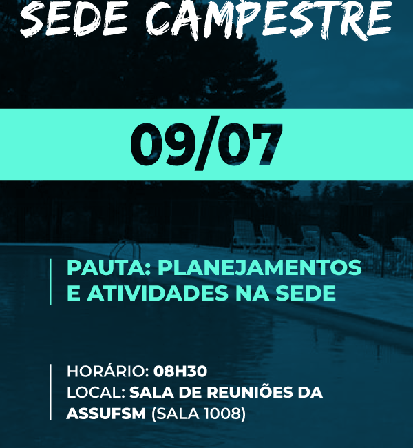 A Assufsm convida a todos e todas técnico-administrativas em educação filiadas para participarem da reunião da Comissão da Sede Campestre, na segunda-feira, 09, às 8h30. Na pauta estão planejamento de atividades na Sede, e a definição de participações no casamento caipira da Assufsm.