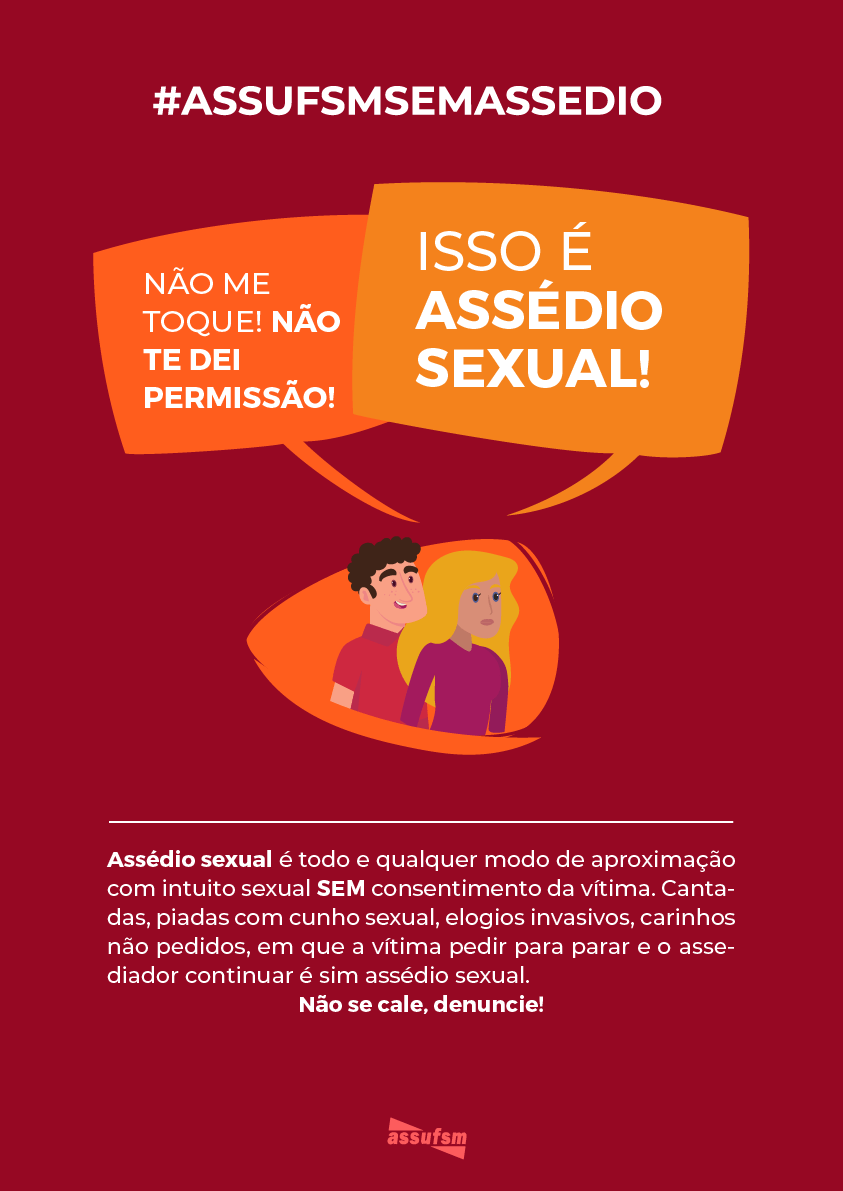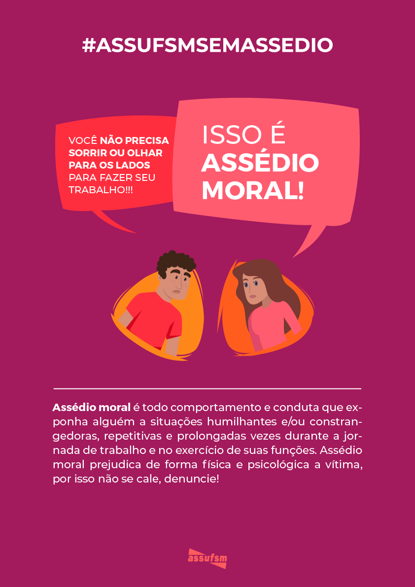 Cada vez mais se torna necessário lutar contra o assédio no ambiente de trabalho. Levando isso em consideração, nesta terça-feira, 17, o setor de Comunicação da Assufsm lançou a campanha “Assufsm sem Assédio”. A ideia é conscientizar a todos e todas as consequências de como o Assédio Moral e Sexual afeta o bem-estar físico e psicológico das trabalhadoras e trabalhadores.