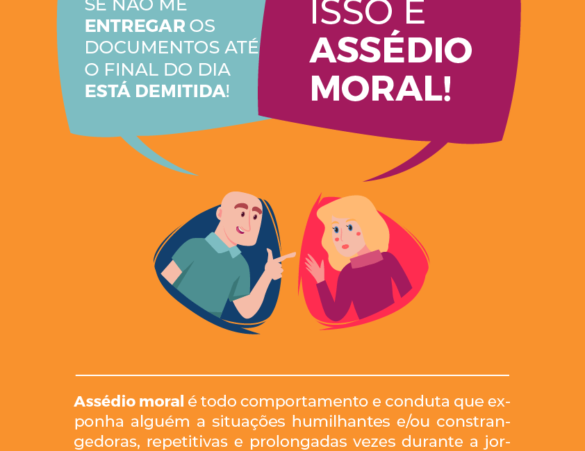 Assédio moral é todo comportamento e conduta que exponha alguém a situações humilhantes e/ou constrangedoras, repetitivas e prolongadas vezes durante a jornada de trabalho e no exercício de suas funções. Ameaças constante de demissão, constrangimento e humilhação públicas, autoritarismo e intolerância de gerências e chefias, imposição de jornadas extras de trabalho, desmoralização e menosprezo de trabalhadores e trabalhadoras, assédio sexual, isolamento e segregação de trabalhadores e trabalhadoras, insultos e grosserias, discriminação salarial segundo sexo e etnia, ameaça a sindicalizados e sindicalizadas, dificultar a execução de trabalho dos e das colegas.