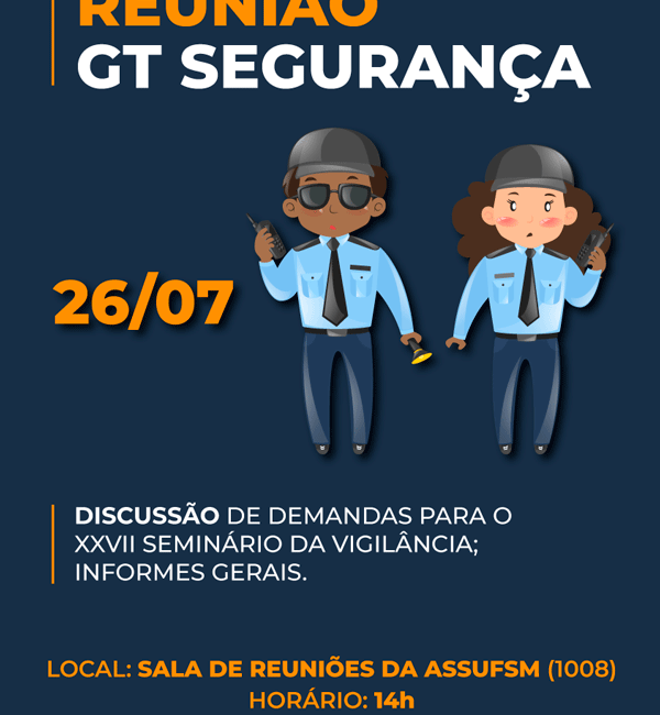 A Assufsm convida a todos os técnico-administrativos em educação vigilantes para participarem da reunião do GT Segurança que acontece na próxima quinta-feira, dia 26, às 14h, na Sala de Reuniões da Assufsm (sala 1008). Na pauta estão demandas para o XXVII Seminário da Vigilância e Informes gerais.