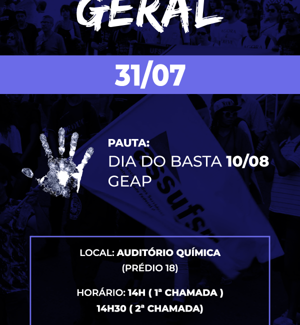 Participe da próxima Assembleia Geral da Assufsm, na terça-feira (31), no Auditório da Química (prédio 18). Com 1ª chamada às 14h e 2ª chamada às 14h30, a assembleia irá debater o 10 de agosto, dia do Basta; e o GEAP.