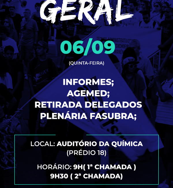 A Assufsm convida todos e todas Técnico-Administrativas em Educação para participarem da Assembleia Geral no dia 06 de setembro. A primeira chamada acontecerá às 9h, e a segunda chamada às 9h30min, o local será o Auditório da Química, no Prédio 18. Na pauta estão: informes, Agemed, e a retirada de delegados para Plenária da Fasubra.