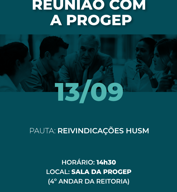 A Assufsm convida a todos e todas técnico-administrativas em educação da UFSM a participarem da reunião com a PROGEP, que acontece nesta quinta-feira (13), às 14h30, na Sala da PROGEP, 4º andar da reitoria. Na pauta estão as reivindicações do HUSM.