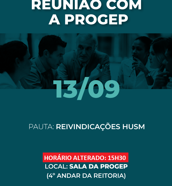 Informamos que a reunião do GT Saúde Assufsm com a PROGEP tem o horário alterado para às 15h30, na Sala da PROGEP (4º andar da reitoria). Na pauta estão as reivindicações do HUSM.