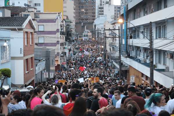 O dia 29 de setembro, em cidades de todo o Brasil, foi marcado pela luta da população, principalmente feminina contra o fascismo, a extrema-direita e o conservadorismo. O movimento, que surgiu nas redes sociais através do grupo “Mulheres contra Bolsonaro”, saiu da internet e tomou as ruas de todo o país. A palavra de ordem “ELE NÃO” ecoou também pelas principais ruas de Santa Maria, em uma passeata que reuniu cerca de 10 mil pessoas, de acordo com as organizadoras do evento.