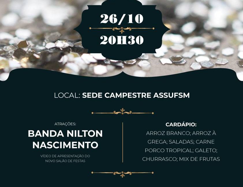 A Assufsm convida seus filiados para o tradicional Jantar Baile da entidade em homenagem ao Dia do(as) Servidor(as) Público(as). Neste ano o jantar ocorre no dia 26 de outubro, sexta-feira, a partir das 20h30, na Sede Campestre da Assufsm (Rua da ABS, acesso pela Faixa de São Sepé), com animação do grupo musical “Nilton Nascimento”.