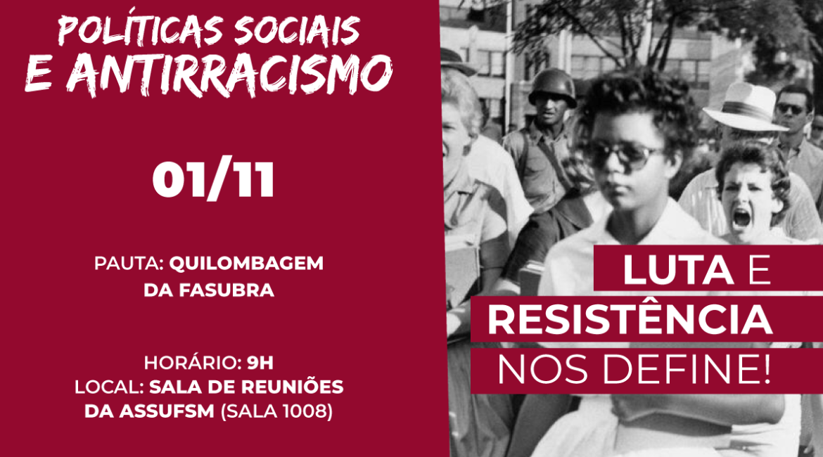 A Assufsm convida a todos e todas técnico-administrativas em educação negras para participarem da próxima reunião do GT Políticas Sociais e Antirracismo, que acontece na quinta-feira, 1º de novembro, às 9h, na Sala de Reuniões da Assufsm. Na pauta está o “Quilombagem da Fasubra”, reunião do GT Antirracismo da entidade.
