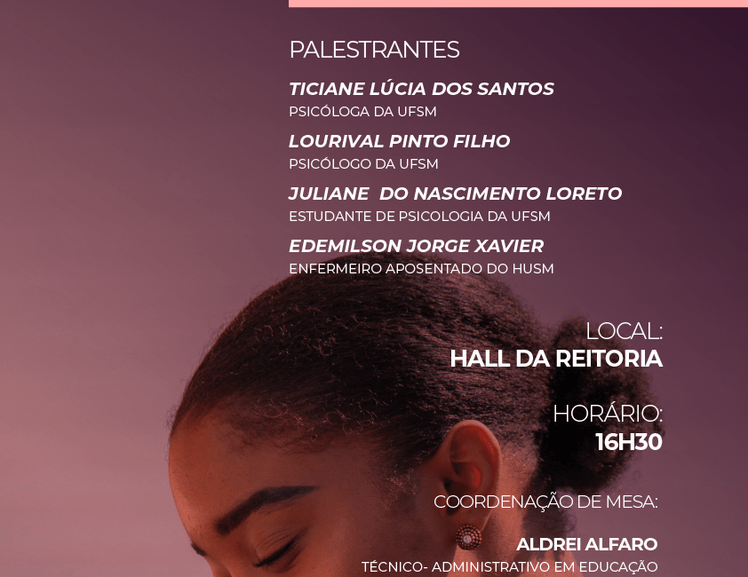 Na terça-feira, 06 de novembro, inicia as atividades unificadas do Mês da Consciência Negra que está sendo promovidas pela Assufsm. Neste dia, acontecerá às 16h30, no Hall da Reitoria o debate sobre “Saúde Mental da População Negra” com a participação da técnico-administrativa em educação e psicóloga Ticiane Lúcia dos Santos; do também técnico-administrativo em educação e psicólogo Lourival Pinto Filho; da estudante de Psicologia na UFSM, Juliane Loreto e do técnico-administrativo aposentado e enfermeiro Edemilson Xavier. A coordenação da mesa será do técnico-administrativo em educação Aldrei Alfaro.