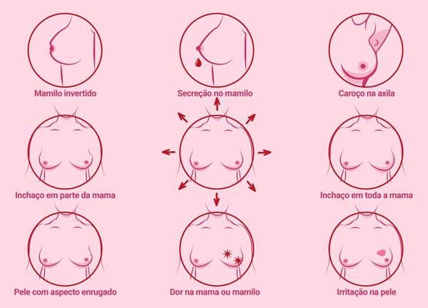 Além disso, a mulher deve ter o cuidado com o aparecimento dos outros sintomas do câncer, tais como: vermelhidão na região da mama; dor; inchaço; sensação de calor; secreção que saia dos mamilos sem apertá-los; ver uma assimetria, com tamanho muito variado, das mamas em um processo mais rápido do que o normal (visto que as mamas são assimétricas, mas com tamanho pouco variado). Com esses sintomas, a mulher ou homem, devem procurar ajuda médica o mais rápido possível.