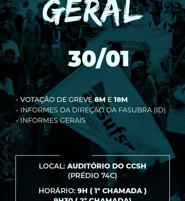 A coordenação da Assufsm convida todos e todas técnico administrativas em educação para a próxima assembleia geral que será realizada no Auditório do CCSH (prédio 74 C) na quinta-feira (30), com primeira chamada às 9h e segunda chamada às 9h30min.