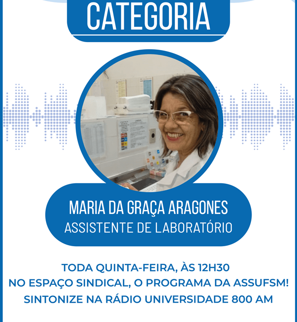 Nesta quinta-feira (30), você conhece a história do técnico-administrativa em educação Assistente em Laboratório, Maria da Graça Aragones, às 12h30, na Rádio Universidade 800AM. Você também pode acompanhar, ao vivo, pelo facebook da Assufsm ou online pelowww.ufsm.br/radio