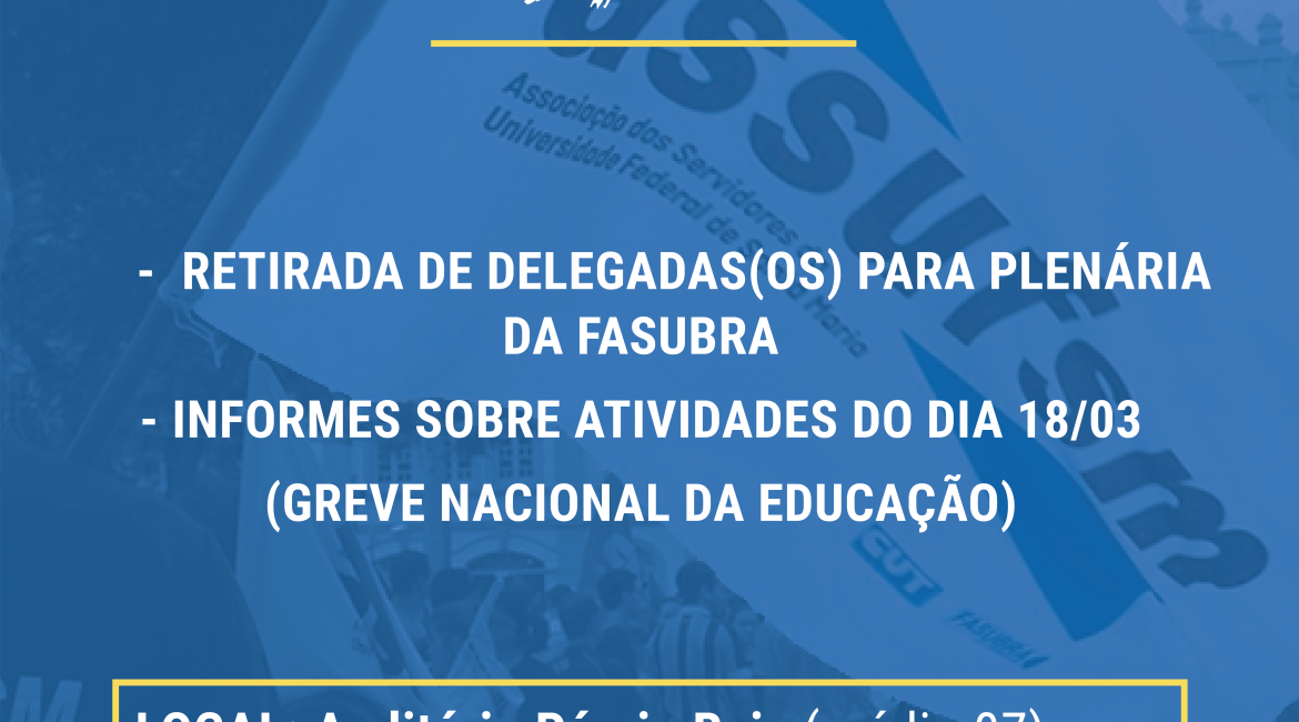 A coordenação da Assufsm está convocando os técnico-administrativos e administrativas em educação para a Assembleia Geral da categoria no dia 09 de março.