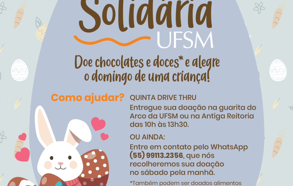 A Universidade Federal de Santa Maria, por meio do Observatório de Direitos Humanos (ODH), está promovendo a campanha Páscoa Solidária UFSM. O objetivo da ação é garantir o abastecimento das necessidades básicas de famílias mais vulneráveis de Santa Maria.