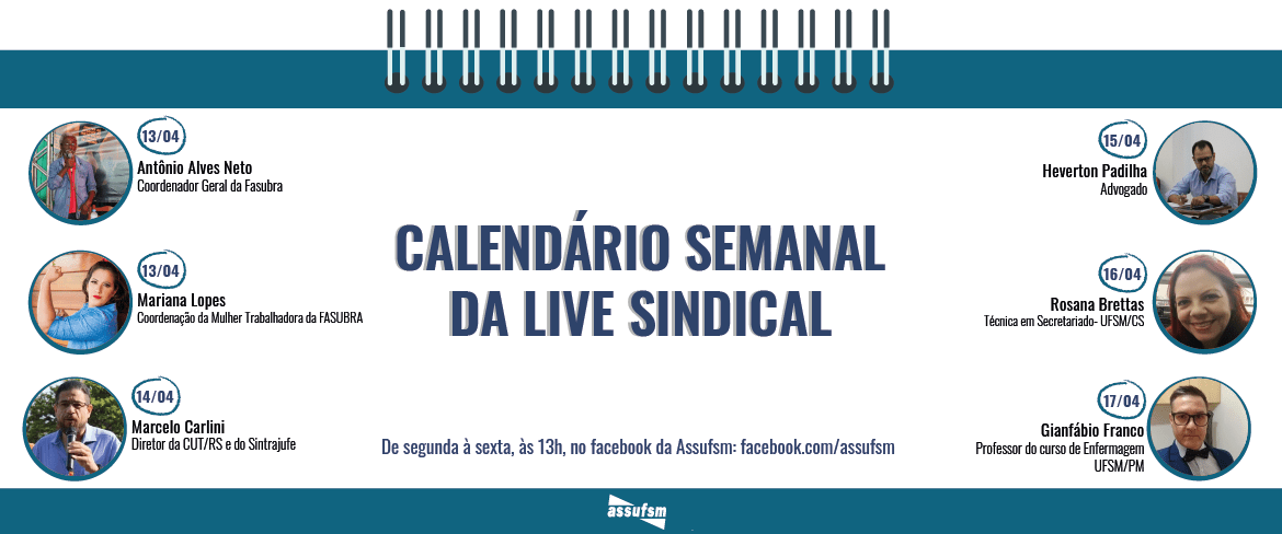 Desde a orientação de quarentena e isolamento, devido a situação do COVID-19, a Assufsm tem promovido a Live Sindical, às 13h, no facebook. A ideia é manter a categoria informada com conteúdo de relevância do cenário atual no país. Confira a agenda de participações da próxima semana: