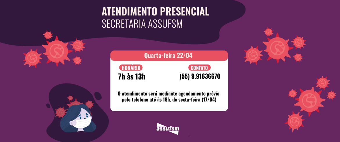 A Assufsm informa que na quarta-feira (22), das 7h às 13h, haverá atendimento presencial na Secretaria, 10º andar da reitoria, sala 1006. O atendimento presencial é somente para exclusões da Unimed e para isso é obrigatória a apresentação do cartão titular e de dependentes.