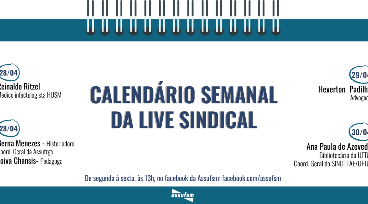 Toda a semana o setor de Comunicação da Assufsm está apresentando a Live Sindical, às 13h, através do facebook. O objetivo é manter a categoria informada com conteúdo de relevância do cenário atual do país. Confira a agenda de participações para a próxima semana: