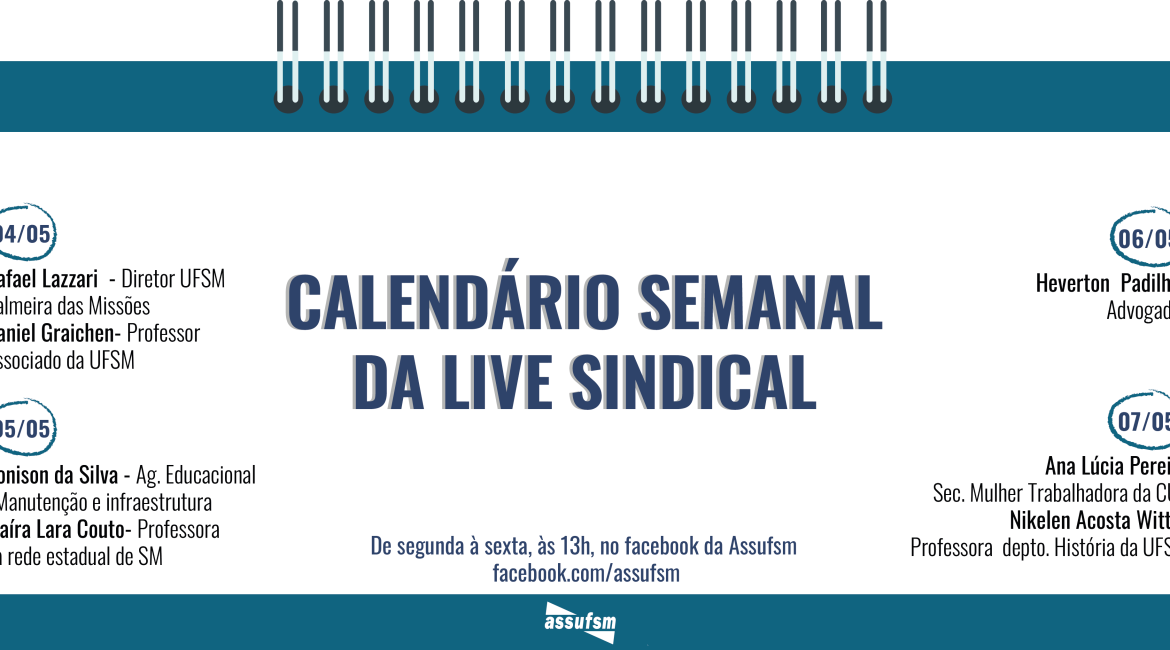 Toda a semana o setor de Comunicação da Assufsm está apresentando a Live Sindical, às 13h, através do facebook. São diferentes temáticas, com convidados (as) especiais. Confira a agenda de participações para a próxima semana: