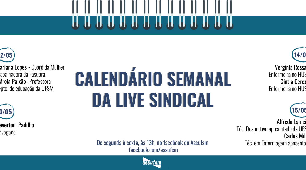 Toda a semana o setor de Comunicação da Assufsm está apresentando a Live Sindical, às 13h, através do facebook. São diferentes temáticas, com convidados (as) especiais. Confira a agenda de participações para a próxima semana: