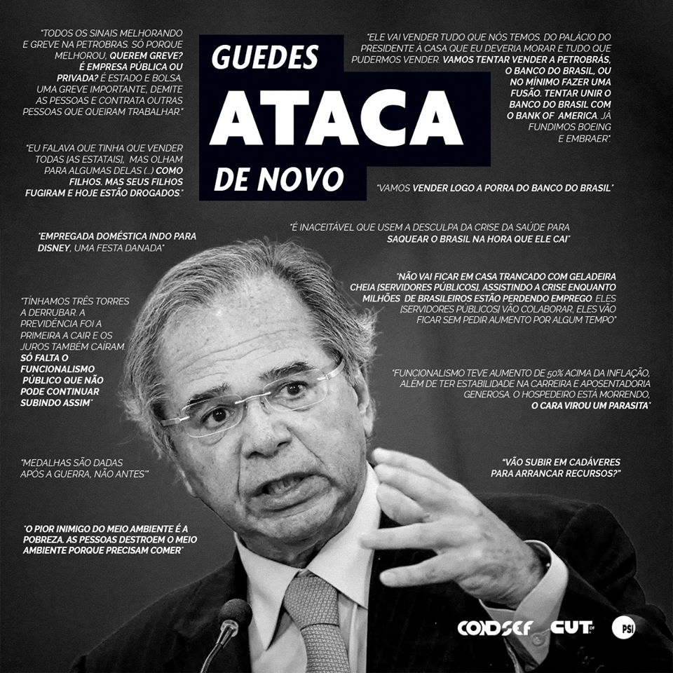Em mais um show de horrores, Paulo Guedes, um dos ministros que desfere ofensas frequentes contra servidores, voltou a atacar. Enfatizando a importância de Bolsonaro vetar o trecho de socorro a estados e municípios que permite reajuste salarial a algumas categorias do funcionalismo público, a despeito da pandemia do novo Coronavírus, o ministro pediu a “contribuição” da categoria e afirmou que “é inaceitável que tentem saquear o gigante que está no chão”. Para Sérgio Ronaldo da Silva, secretário-geral da Confederação, é inadmissível que Guedes compare servidores a saqueadores. O secretário-geral lembra que quem está sendo processado em uma investigação por desviar bilhões em fundos de pensão é o próprio Paulo Guedes.