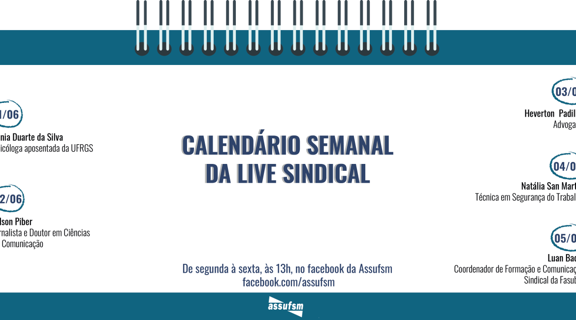 Toda a semana o setor de Comunicação da Assufsm está apresentando a Live Sindical, às 13h, através do facebook. São diferentes temáticas, com convidados (as) especiais. Confira a agenda de participações para a próxima semana: