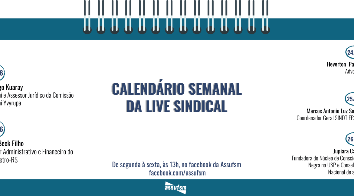 Toda a semana o setor de Comunicação da Assufsm está apresentando a Live Sindical, às 13h, através do facebook. São diferentes temáticas, com convidados (as) especiais. Confira a agenda de participações para a próxima semana: