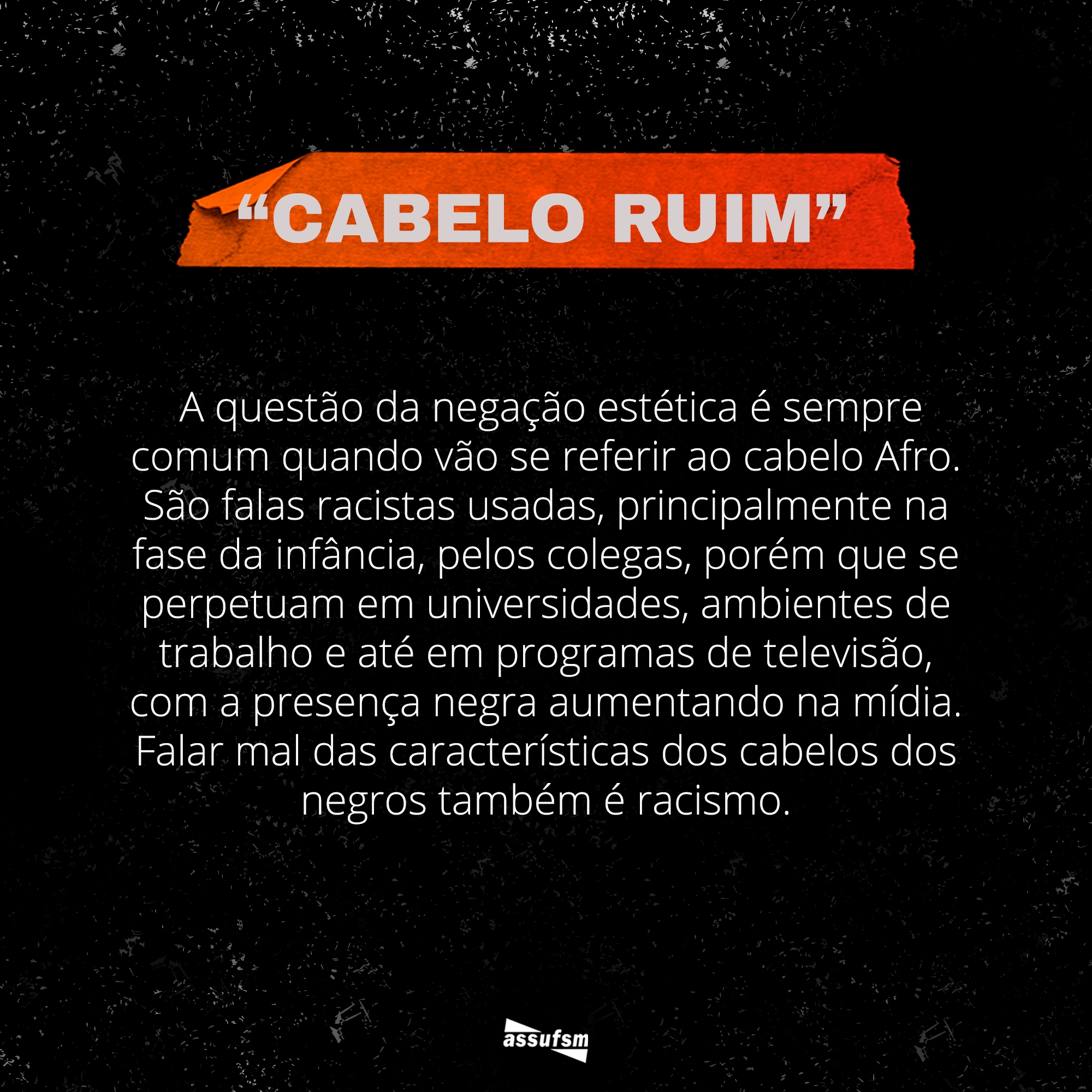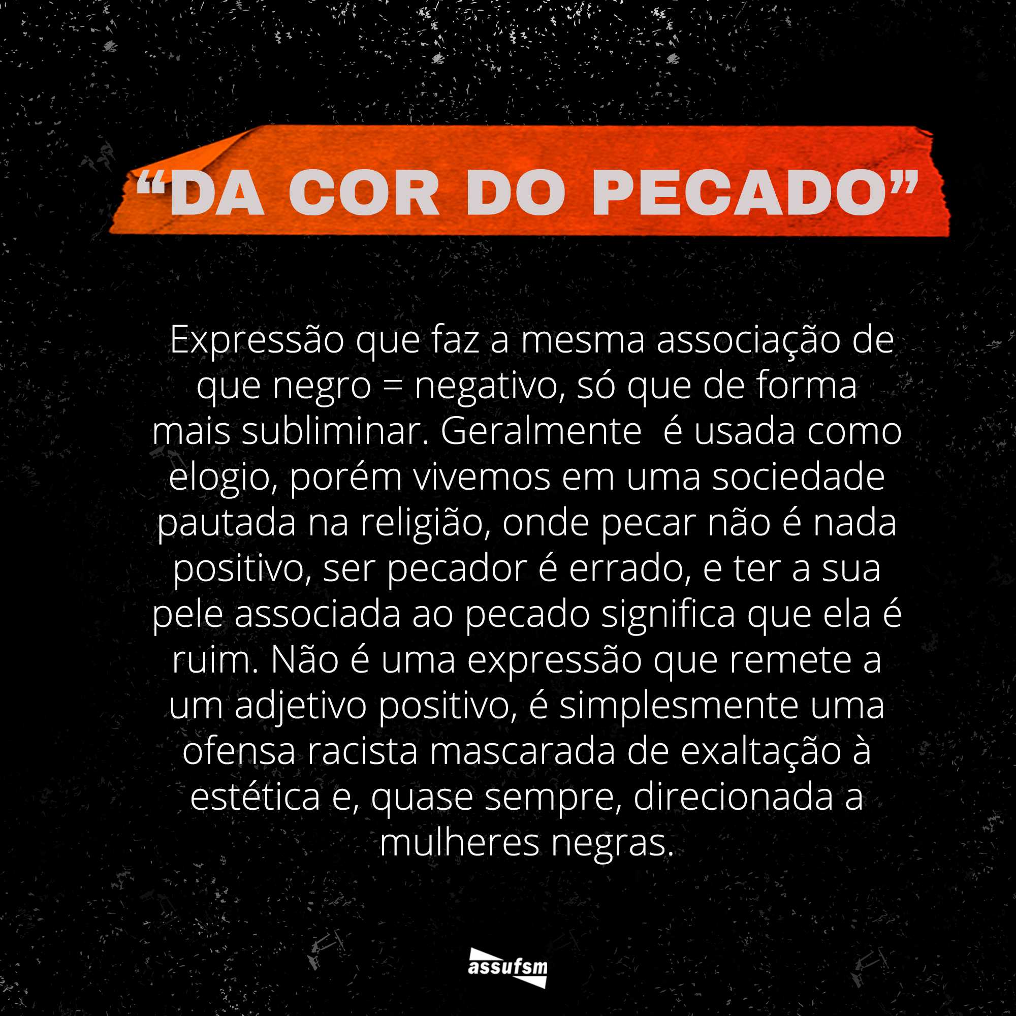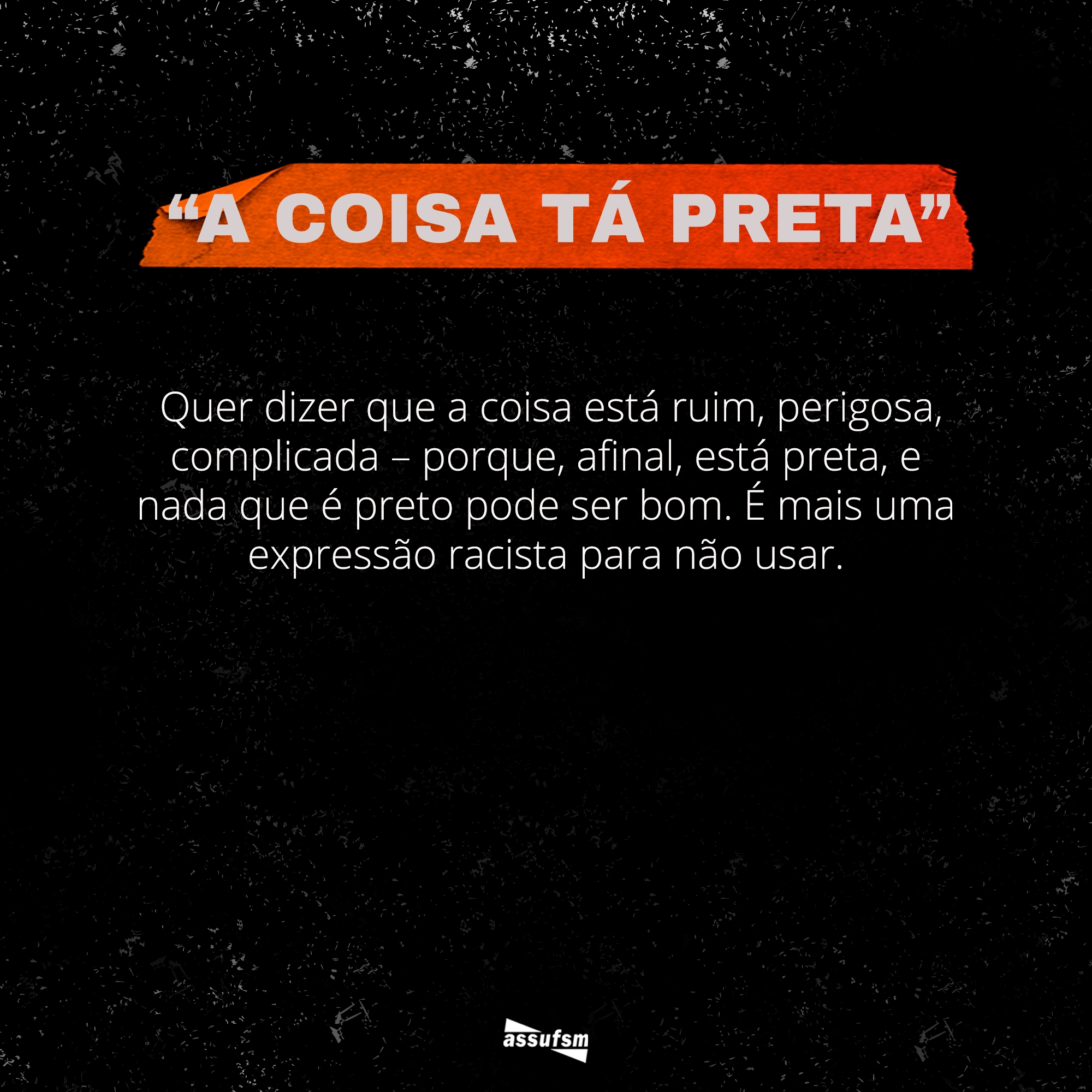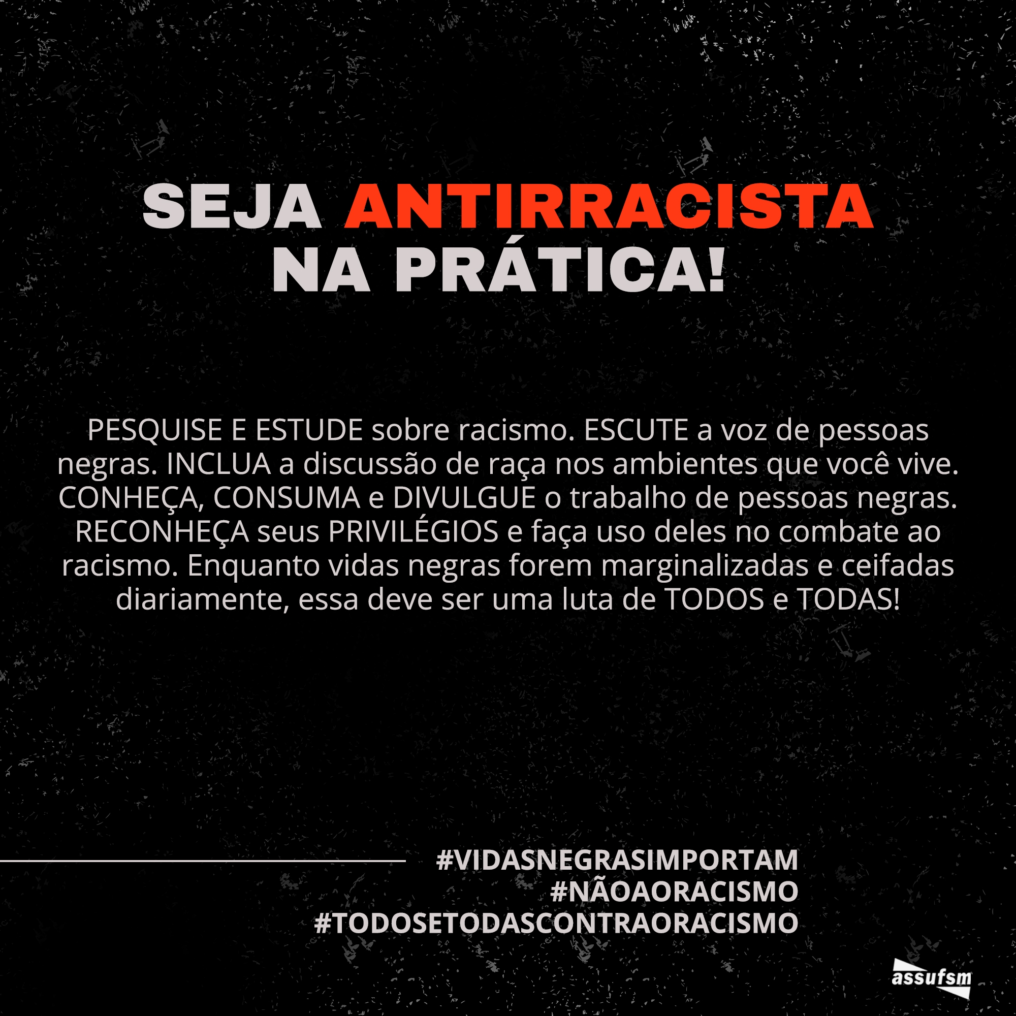 No cotidiano, muitas são as formas que o racismo se configura. A linguagem, por exemplo, carrega muitos significados e reconhecer e excluir do nosso vocabulário expressões racistas, também é uma forma de ser agente antirracista na prática. Confira abaixo o material gráfico da campanha da Assufsm “Vidas Negras Importam”, que encerra nesta sexta-feira (17).