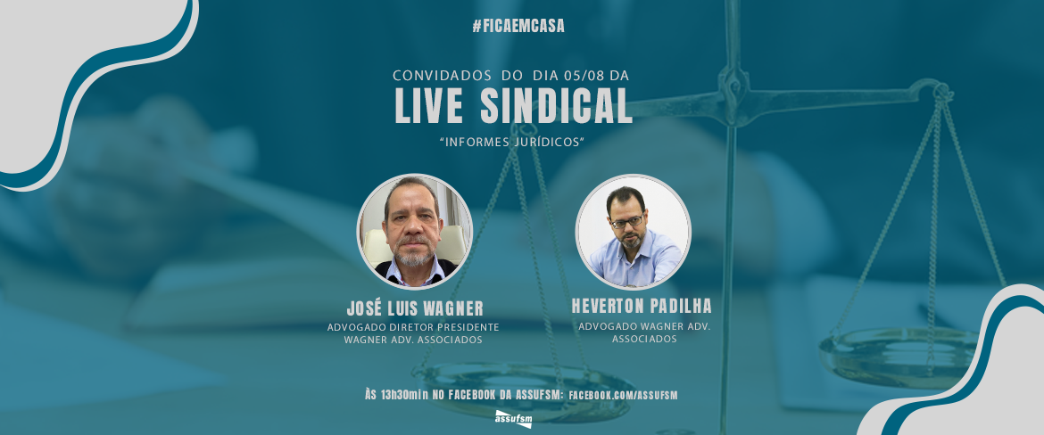 Como é tradicional, quarta-feira é dia de Jurídico na Assufsm. A novidade é que na Live Sindical da Assufsm, na quarta-feira (5), às 13h, além da participação do advogado Heverton Padilha, também contaremos com a presença do advogado José Luis Wagner, da Wagner Advogados Associados. Como pauta, teremos informes jurídicos locais e nacionais.