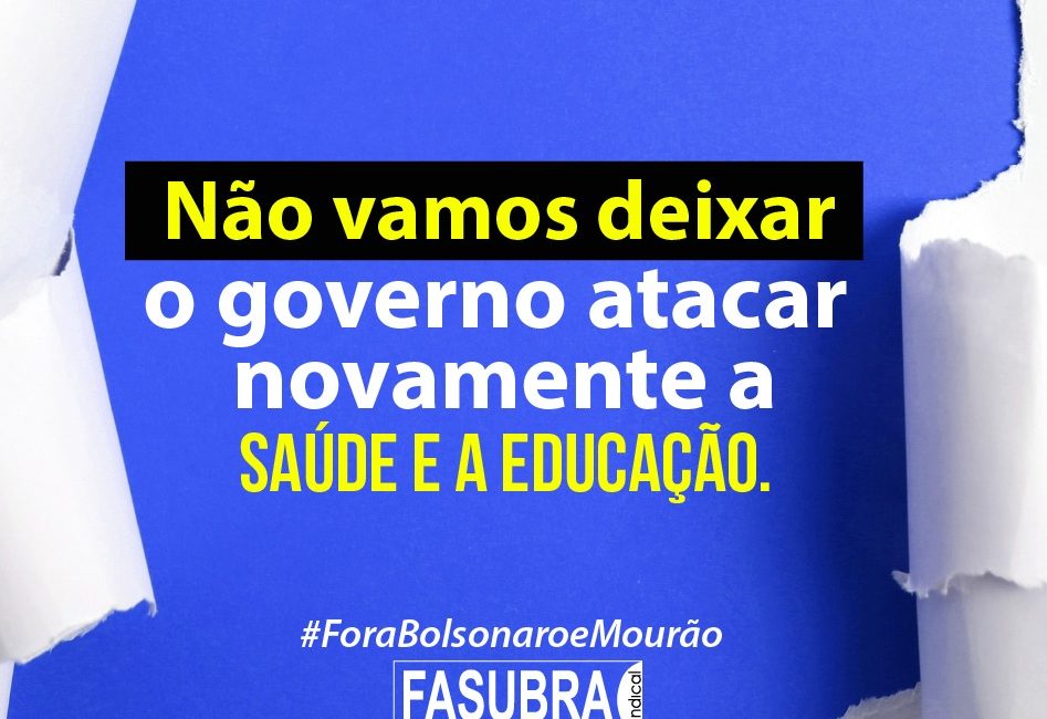 #pracegover: arte com fundo branco e detalhe no centro em azul, com os dizeres em amarelo e branco, além de uma tarja preta: Não vamos deixar o governo atacar novamente a Saúde e a Educação. Embaixo a hashtag Fora Bolsonaro e Mourão e a logo da FASUBRA