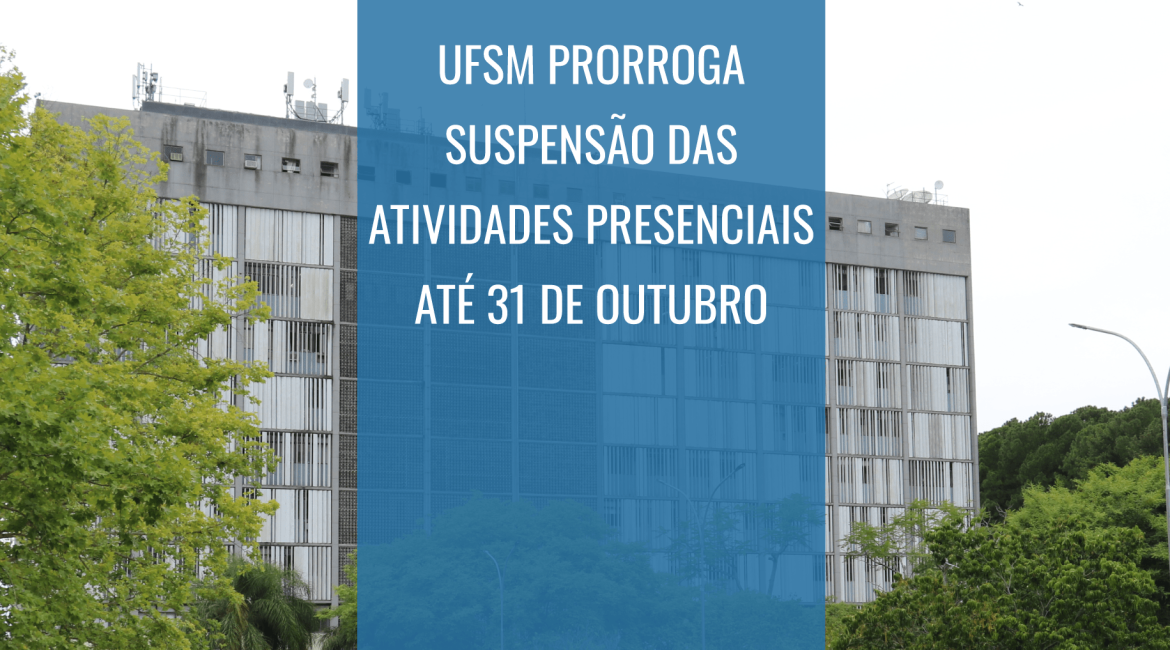 Através da portaria n°. 98.626, de 25 de setembro de 2020, a UFSM suspende as atividades acadêmicas e administrativas presenciais até 31 de outubro de 2020.