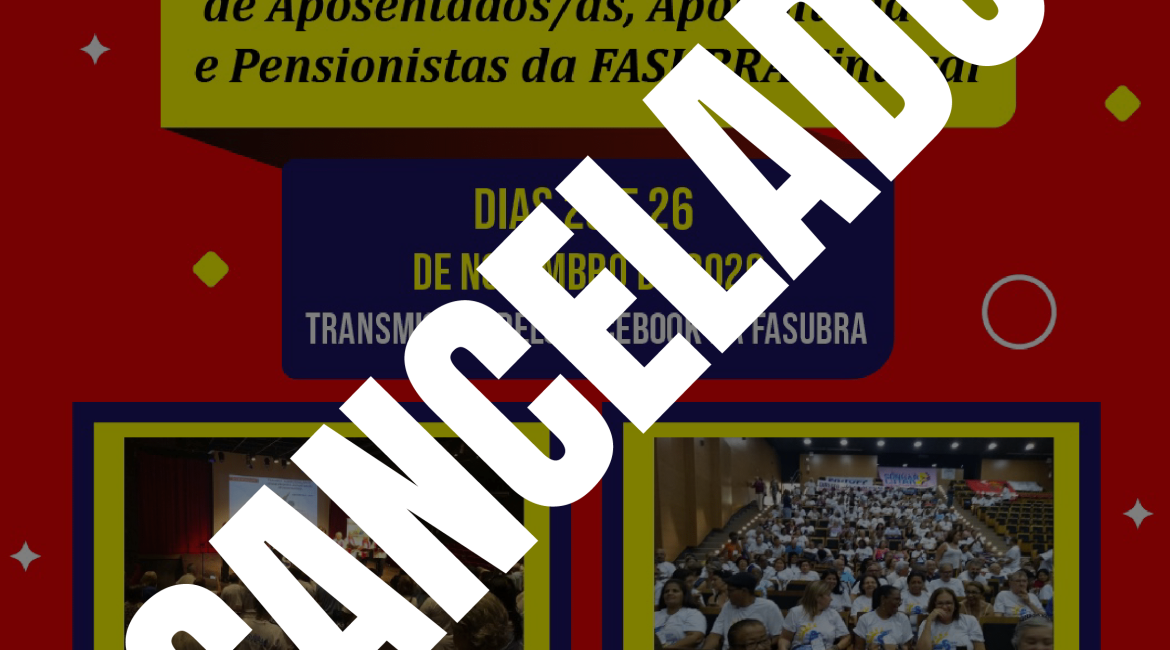 A Fasubra informa que o “VII Encontro Nacional de Aposentados, Aposentadas, Aposentandos e Pensionistas”, que seria realizado nos dias 25 e 26 de novembro foi cancelado.