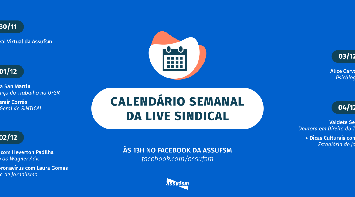 Segunda-feira (30/11) – “Segunda Assembleia Geral Virtual da Assufsm” (ver aqui). Nesse dia NÃO teremos Live Sindical.