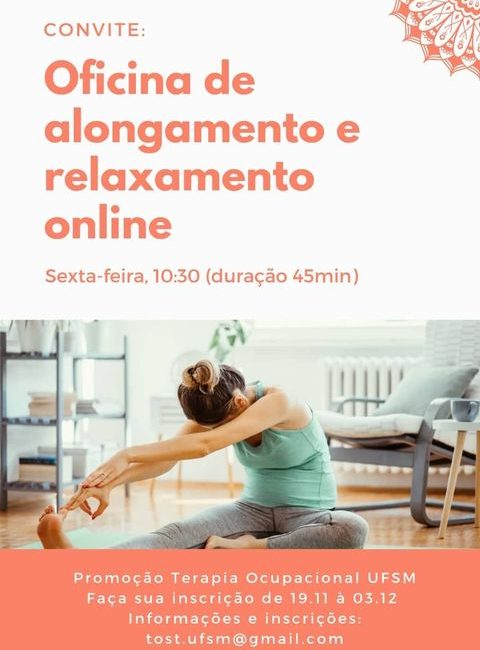 O curso da Terapia Ocupacional da Universidade Federal de Santa Maria (UFSM) convida todas e todos para as oficinas de alongamento e relaxamento online. A prática será realizada toda sexta-feira, com início na próxima semana (04), as 10h30, com duração de 45 minutos.