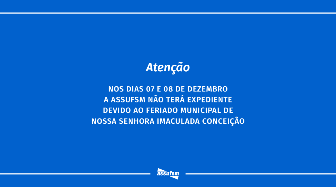 A Assufsm informa que, devido ao Feriado Municipal de Nossa Senhora Imaculada Conceição, não terá expediente nos dias 7 e 8 de dezembro – segunda e terça-feira.