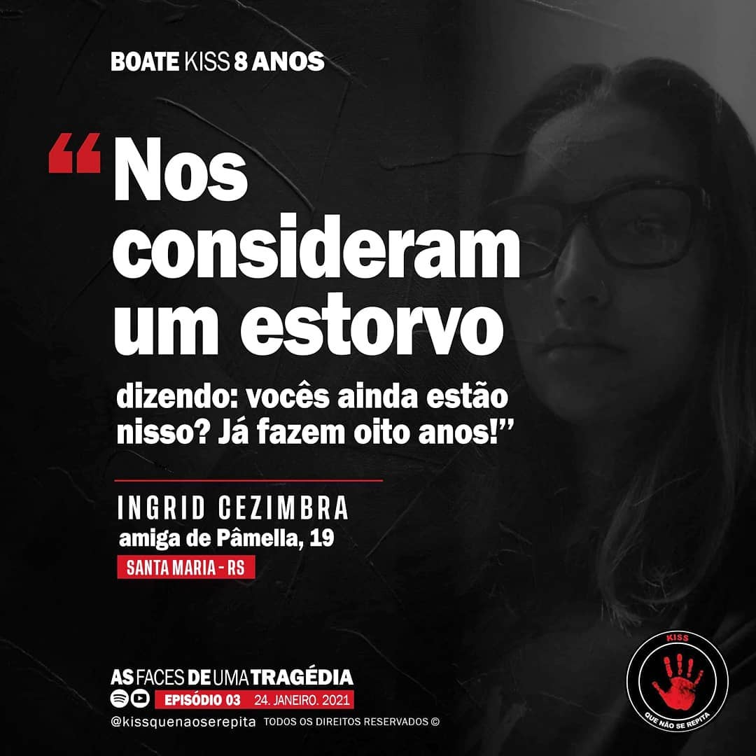 A página Kiss: que não se repita, nas homenagens de 2021, realizou uma série de podcasts com amigos, amigas, pais e familiares de vítimas da tragédia da boate Kiss. Entre um dos depoimentos, está o de Ingred Cezimbra, que perdeu a amiga Pâmella Lopes. Veja abaixo um pouco do relato dela: