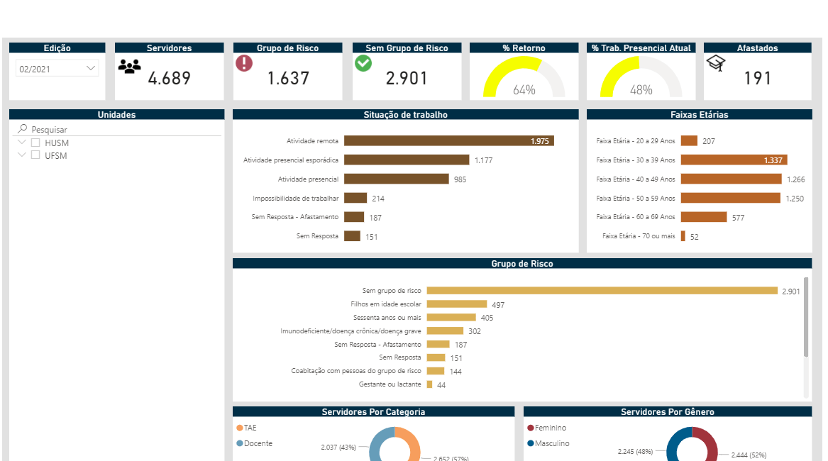 O Centro de Processamento de Dados (CPD) desenvolveu – com os dados do questionário on-line Situação do Servidor (Covid-19), que deve ser respondido todos os meses pelos servidores da UFSM no Portal de Recursos Humanos – um painel que contém dados estatísticos relativos à situação de trabalho e grupo de risco dos 4.689 servidores(as) da instituição, incluindo docentes e técnico-administrativos.
