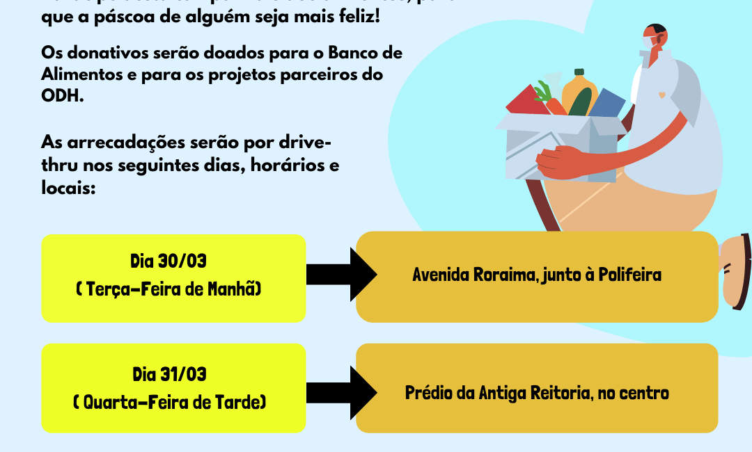 O Observatório de Direitos Humanos UFSM, vinculado à Pró-Reitoria de Extensão, promove, na terça (30) e na quarta-feira (31), a campanha Páscoa Solidária 2021. A ação recolherá donativos para serem encaminhados ao Banco de Alimentos de Santa Maria e para projetos parceiros do Observatório. A arrecadação, além de levar solidariedade aos lares de Santa Maria, busca fazer com que o caráter lúdico, que é tão importante para o desenvolvimento infantil, não se perca, mesmo com esse período de crise por conta da pandemia.