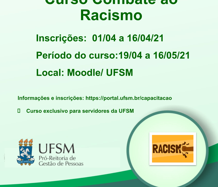 A Pró-Reitoria de Gestão de Pessoas informa que estão abertas as inscrições para o Curso Combate ao Racismo – EAD. A capacitação tem como objetivo capacitar as redes da instituição de combate ao racismo, coibir a produção e a reprodução de práticas discriminatórias e propagar as iniciativas antirracistas na universidade e na cidade.