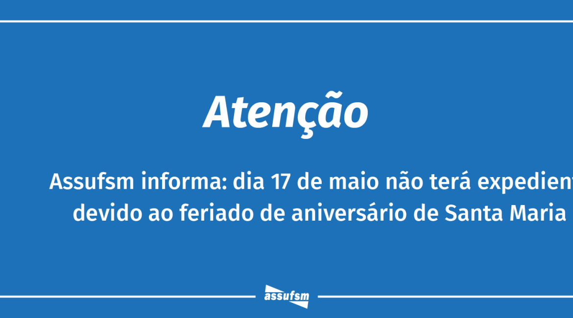 Devido ao feriado de aniversário da cidade de Santa Maria, a Assufsm não terá expediente na segunda-feira (17). As atividades normais voltam na terça-feira (18), a partir das 7h, horário de funcionamento da secretaria do sindicato.