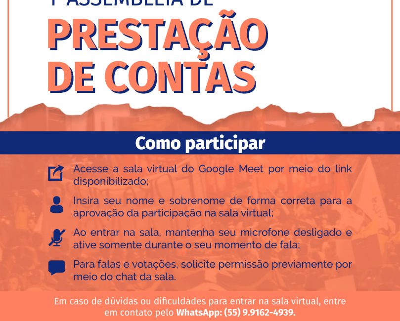 As regras que serão passadas precisam ser seguidas para o melhor andamento da Assembleia. É importante que todas e todos procurem entrar na sala virtual do Google Meet com nome e sobrenome corretos, pois ambos serão verificados. Os e as TAEs que não conseguirem passar pela triagem devem entrar em contato pelo WhatsApp – (55) 9-9162-4939 – para serem devidamente identificados e permitidos. Também é necessário que todos e todas coloquem os locais de trabalho quando entrarem, digam se estão na ativa ou são aposentados(as) e pensionistas e se são filiados(as) do sindicato.