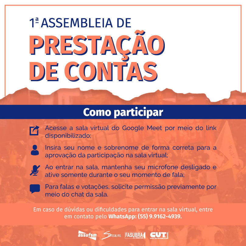 A Assufsm convoca a todos e todas filiadas, Técnico Administrativas em Educação da UFSM para participarem da Primeira Assembleia de Prestação de Contas Virtual, que vai acontecer em sala virtual do Google Meet (o link será divulgado posteriormente), na quinta-feira (20), com primeira chamada às 13h30min e segunda chamada às 14h, com qualquer quórum.