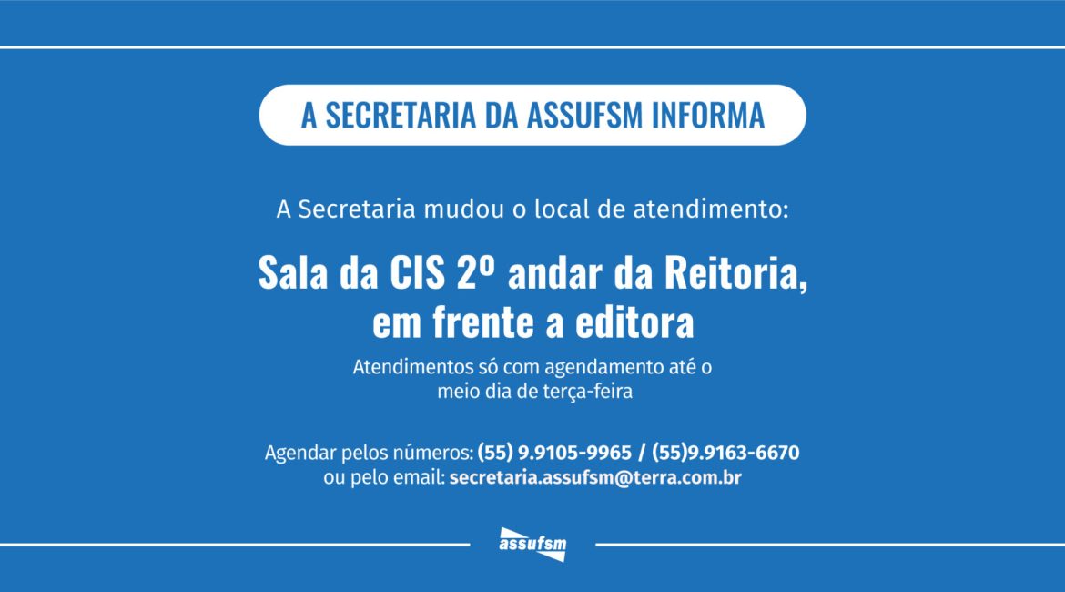 Devido à reformas que estão sendo feitas no 10º andar do prédio da Reitoria, a Secretaria da Assufsm está atendendo presencialmente em outro local de maneira provisória: Sala da CIS, 2º andar do Prédio da Reitoria, em frente a Editoria. Tão logo que seja possível, a sala será identificada. A Secretaria informa que está atendendo apenas pelos números: (55) 9.9105-9965/(55)9.9163-6670 ou pelo e-mail: secretaria.assufsm@terra.com.br. Esses contatos também devem ser usados para o agendamento do atendimento, que deve ser realizado até o meio dia de terças-feiras.