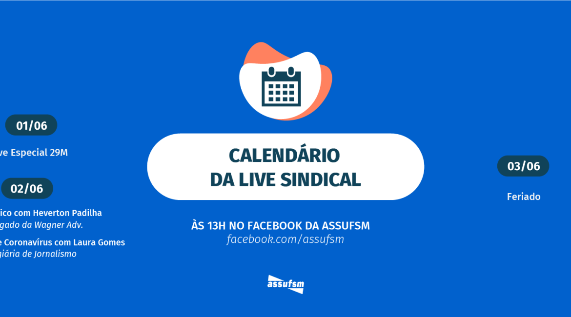 As Lives Sindicais retornaram para o facebook da Assufsm com muitas novidades, como você vem acompanhando. Para a próxima semana, anota ai na agenda quais são as pautas e os convidados(as):