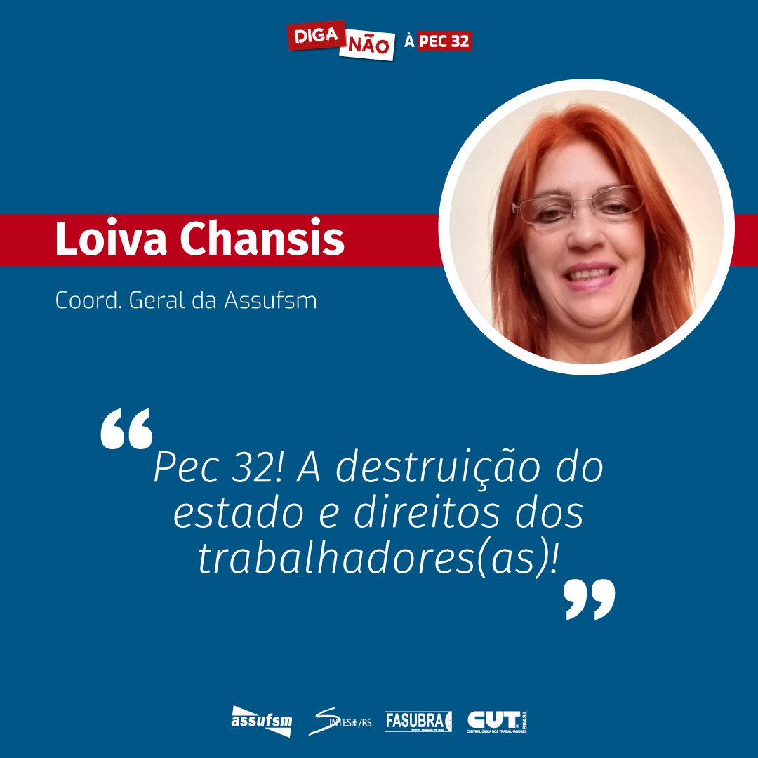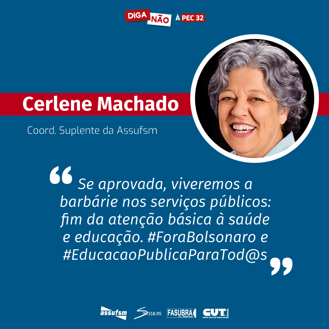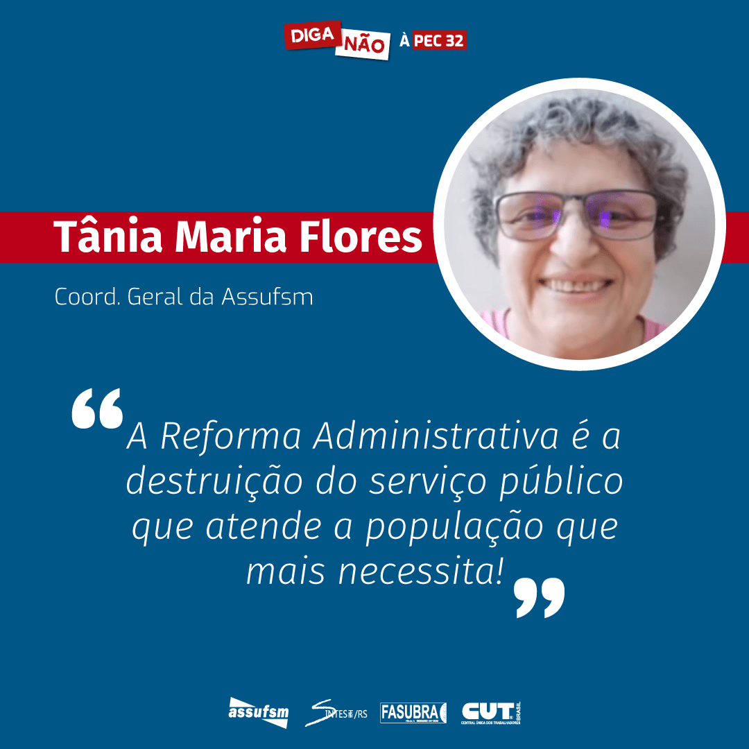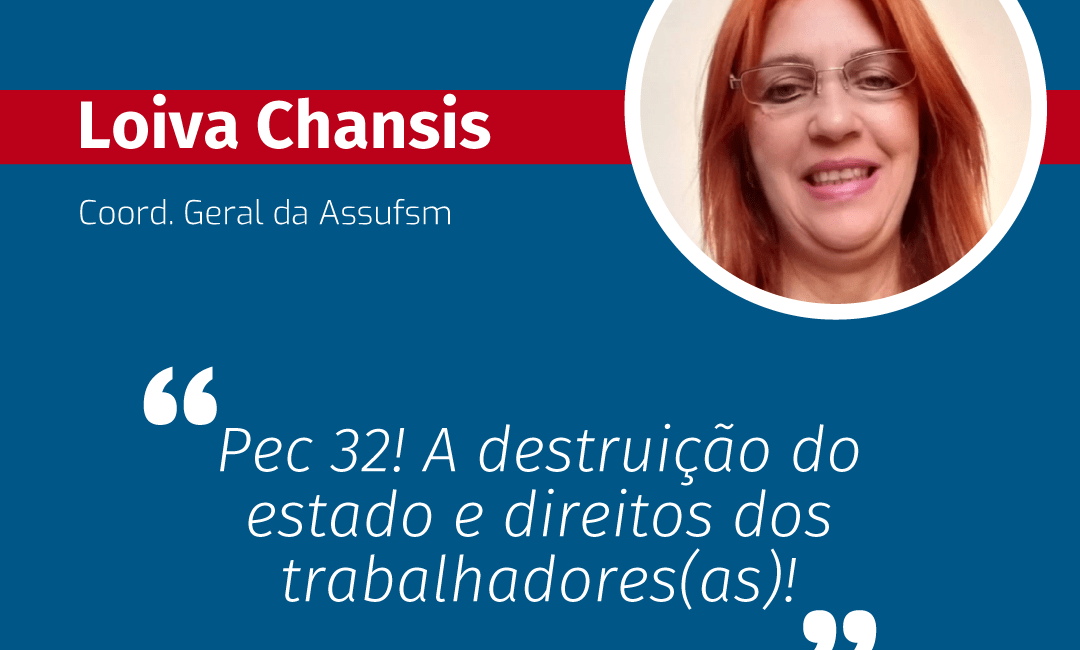 As Coordenadoras Gerais da Assufsm Loiva Chansis e Tânia Flores são unanimes ao afirmar que a PEC 32 é a destruição do Estado, é a destruição do Serviço Público. Para elas, e para os e as Coordenadoras do Sindicato que participaram, enviando seus posicionamentos, a Reforma Administrativa vai prejudicar a saúde e a educação do povo brasileiro.