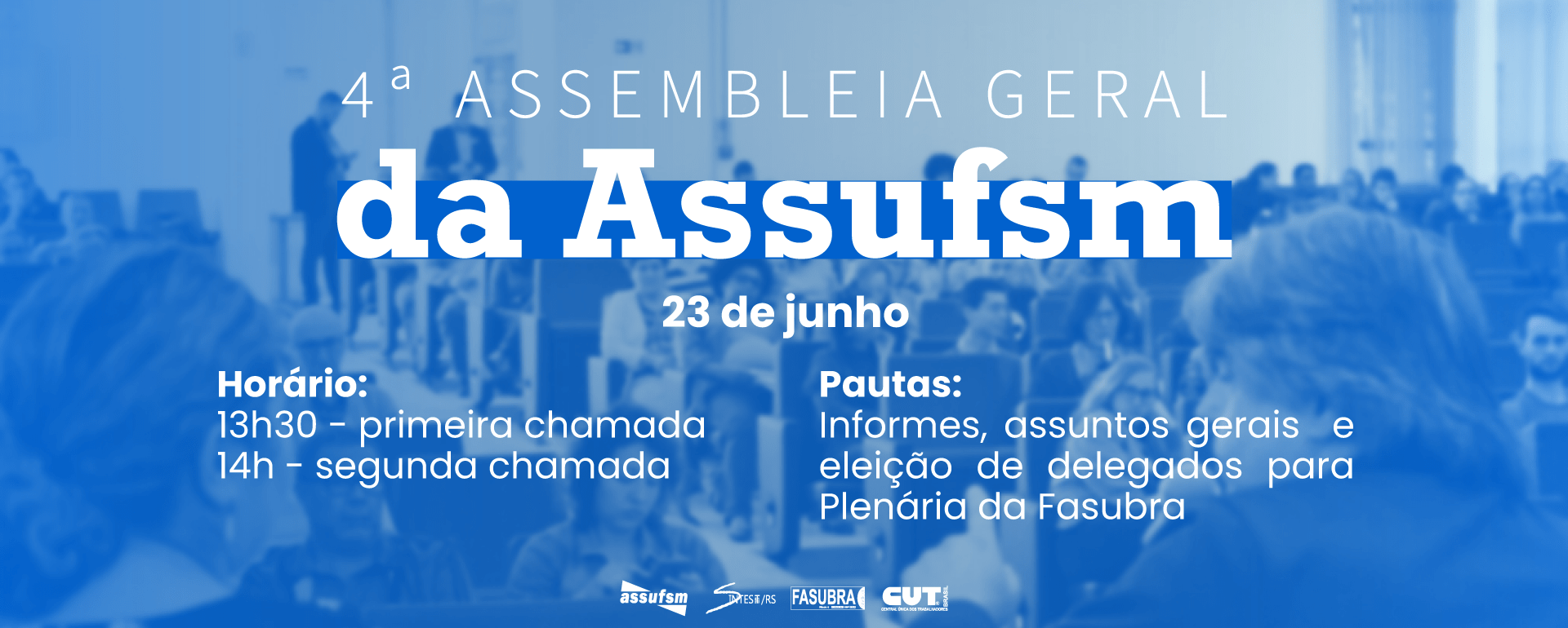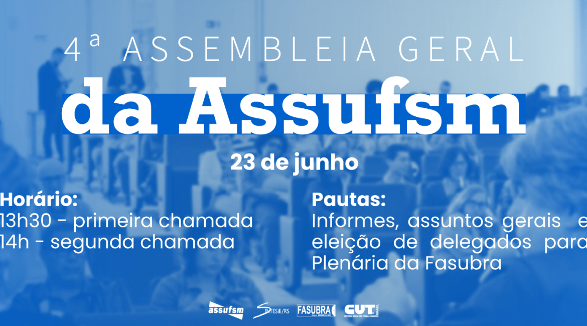 A Assufsm convoca a todos e todas, Técnico Administrativas em Educação da UFSM, para participarem da Quarta Assembleia Geral Virtual e da Assembleia para Plenária Estadual da CUT, que vai acontecer em sala virtual do Google Meet, HOJE, com primeira chamada às 13h30min e segunda chamada às 14h, com qualquer quórum.