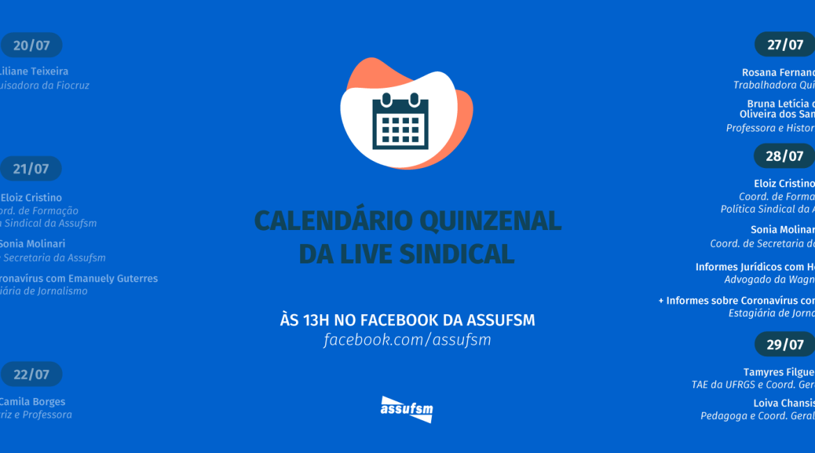Quarta-feira (28/07) – “Informes Jurídicos”, com o Advogado Heverton Padilha, da Wagner Advogados Associados + Boletim Coronavírus, com a Estagiária de Jornalismo da Assufsm, Emanuely Guterres. Também participarão da Live Sindical o Coordenador de Formação Política e Sindical da Assufsm Eloiz Cristino e a Coordenadora de Secretaria Sonia Molinari.