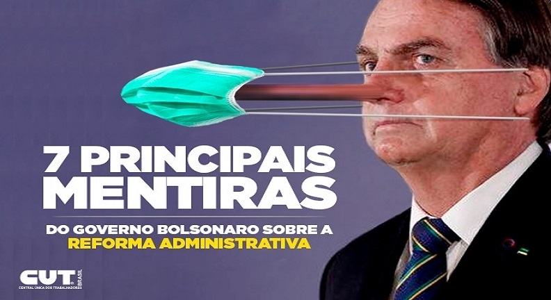 Para aprovar no Congresso Nacional a Proposta de Emenda à Constituição (PEC) 32, da Reforma Administrativa, mais um ataque do governo de Jair Bolsonaro (sem partido) à classe trabalhadora e ao povo, o presidente e ministros vêm apresentando argumentos falsos para convencer a sociedade de que a medida é urgente e necessária. Confira as principais mentiras contadas sobre essa reforma e apoie a luta pelo serviço público e de qualidade no país.