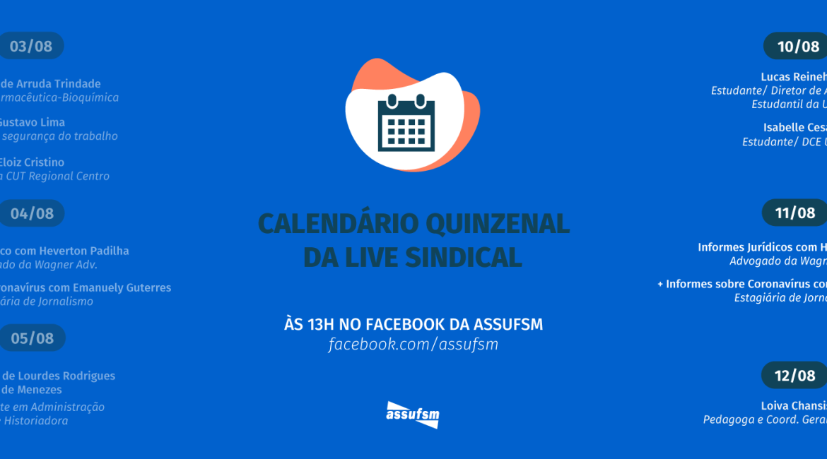 A Assufsm segue debatendo pautas de interesse da categoria na Live Sindical. De terça à quinta-feira, às 13h, pelo facebook do sindicato. Confira as pautas e convidados e convidadas dos próximos dias. Veja: