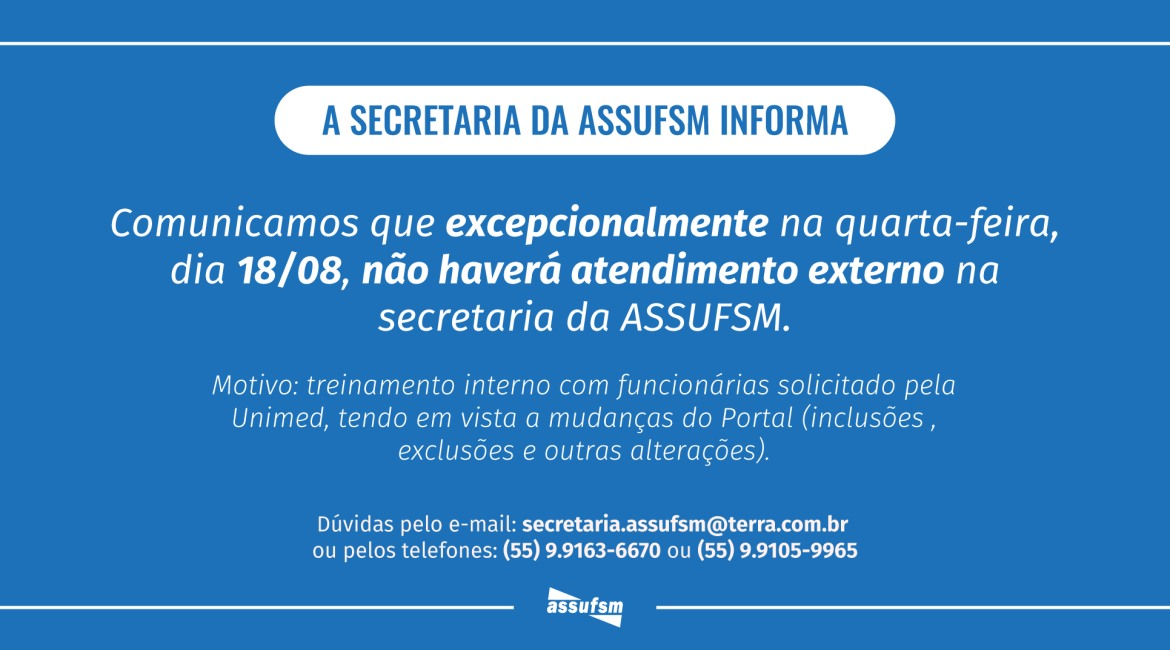 A Assufsm agradece a compreensão de todos e todas e retorna com os atendimentos externos presenciais no dia 25 de agosto. Os atendimentos remotos seguem normalizados. Demais dúvidas e informações podem ser verificadas pelos contatos: (55) 9.9105-9965/(55)9.9163-6670 ou pelo e-mail: secretaria.assufsm@terra.com.br.